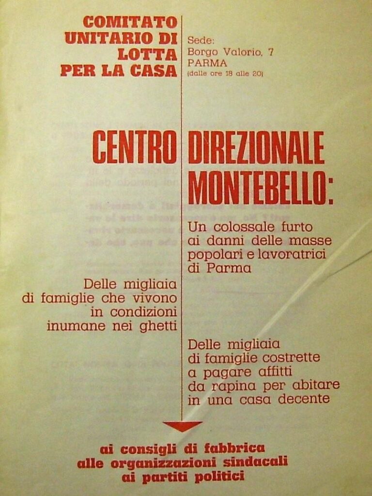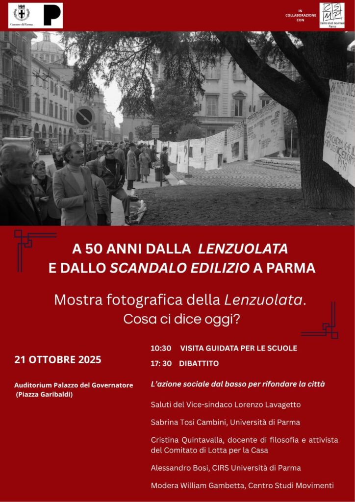 Di questo parleremo martedì 21 ottobre, alle 17,30, presso l’Auditorium di Palazzo del Governatore, in piazza Garibaldi (Parma). Lì avremo la possibilità di riguardare le foto della lenzuolata che cinquant’anni fa, tra il 22 ed il 26 ottobre 1975, il Comitato di lotta per la casa espose pubblicamente in piazza della Pace. Pochi giorni dopo la Magistratura inviò i primi avvisi di reato.
